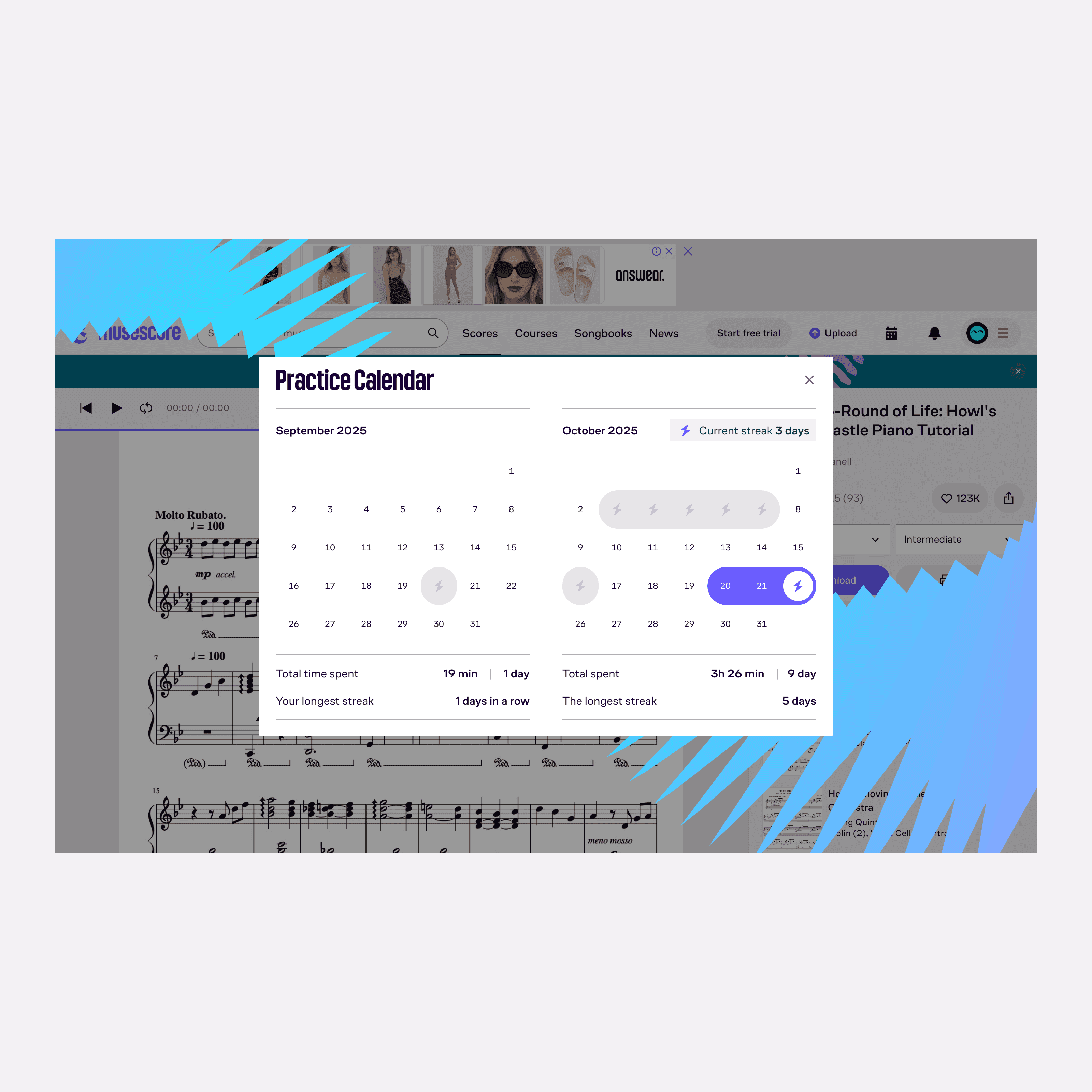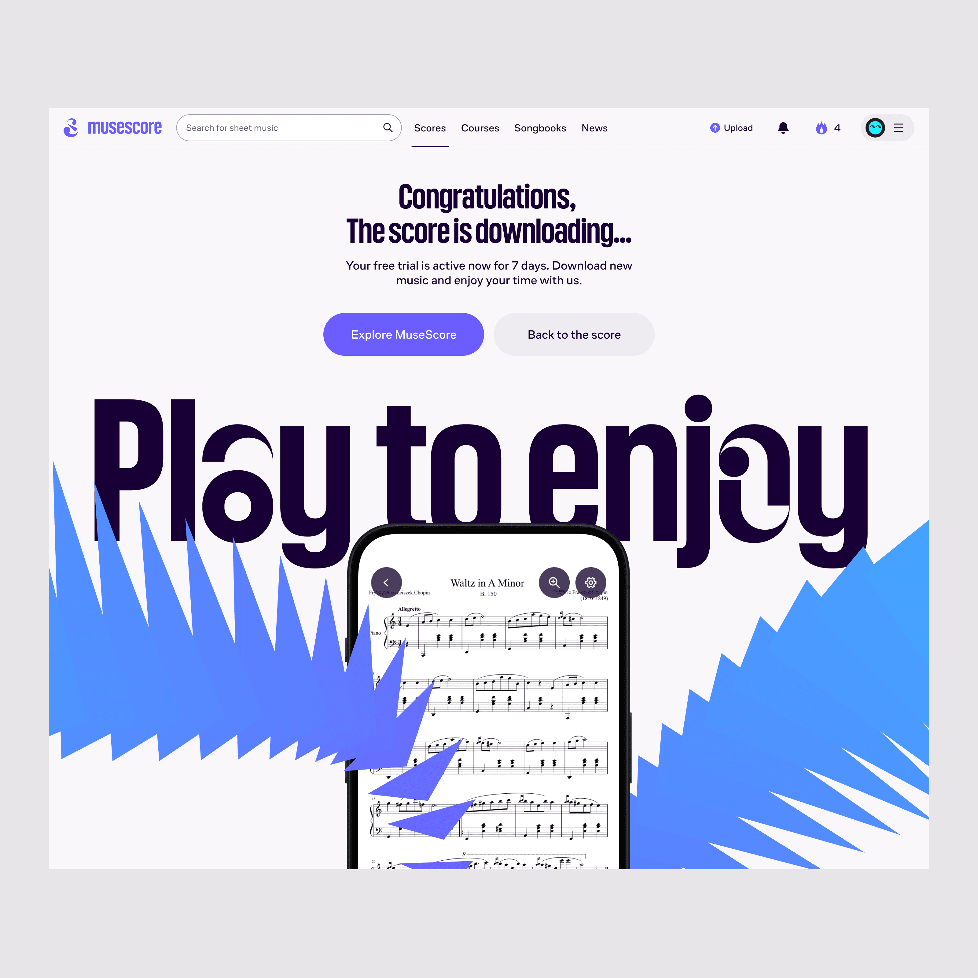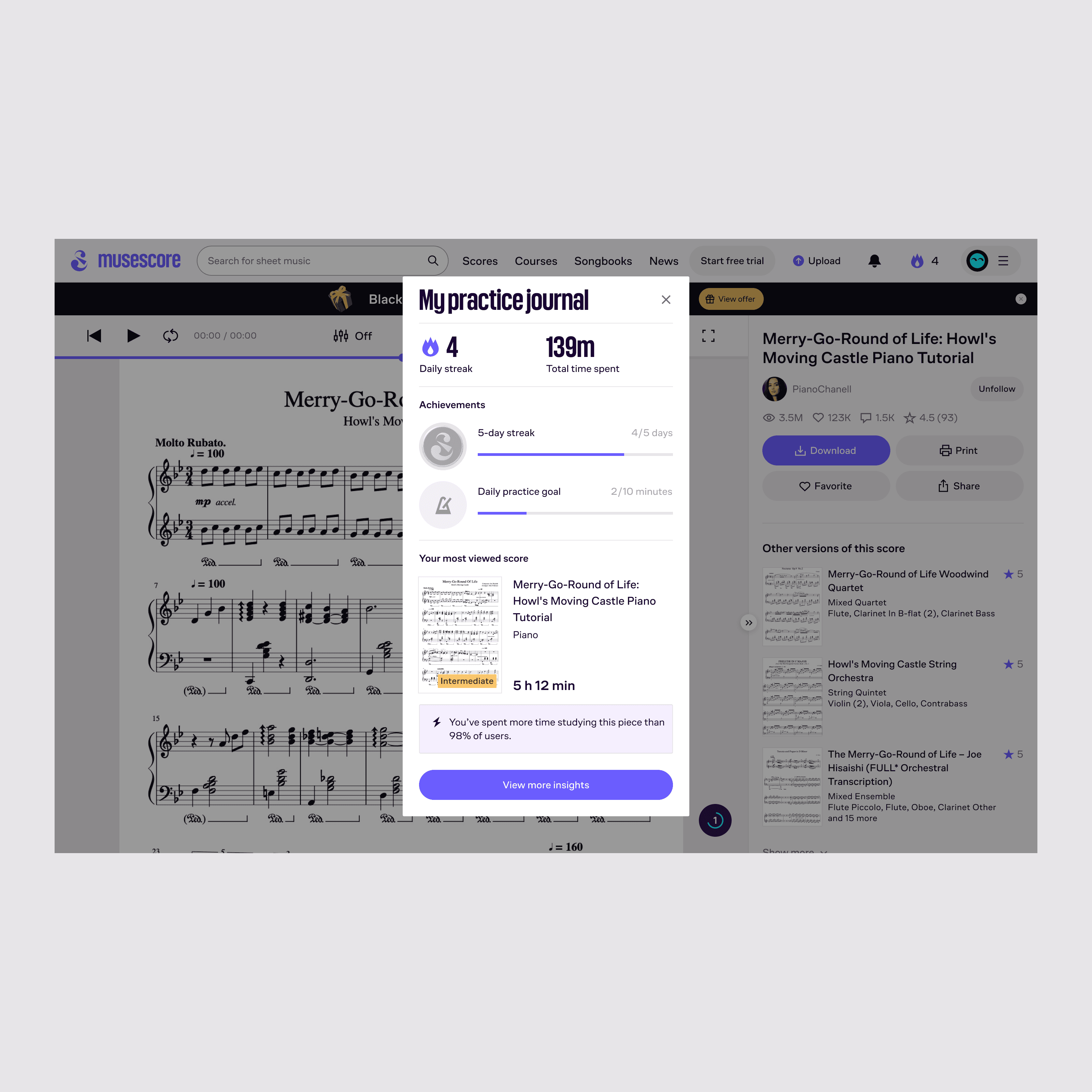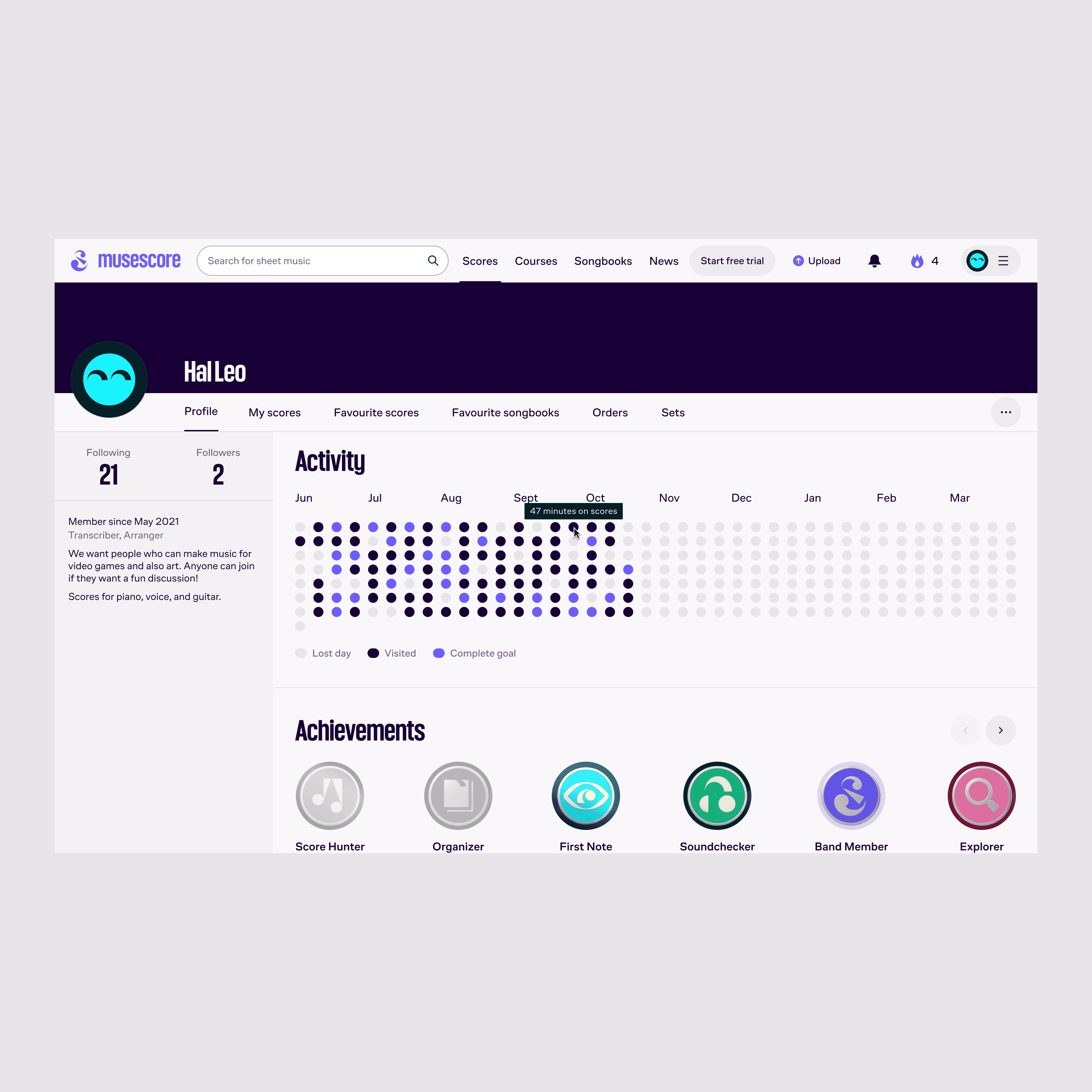 One of my most impactful contributions was designing a new gamification system: Streaks, rewards, and motivational loops, entirely from scratch. This became one of the strongest retention drivers in recent years, giving MuseScore a fresh layer of habit-building mechanics and daily engagement.